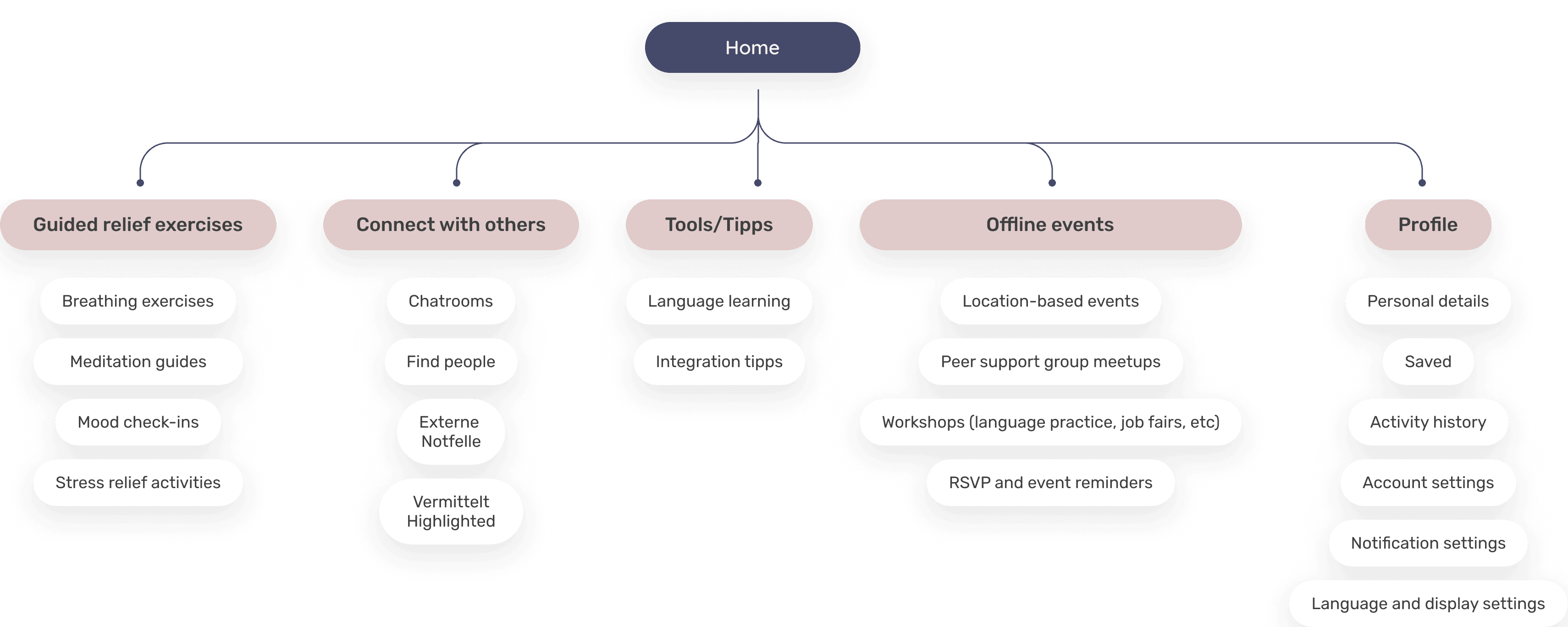 The sitemap is built around five core sections — Relief, Connect, Explore, Offline Events, and Profile — supporting a seamless flow between emotional support, social connection, and practical guidance.