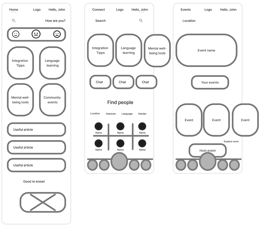 Low-fidelity digital wireframes helped resolve navigation challenges, improve accessibility, and establish a clear visual hierarchy — keeping the focus on structure rather than style at this stage.
