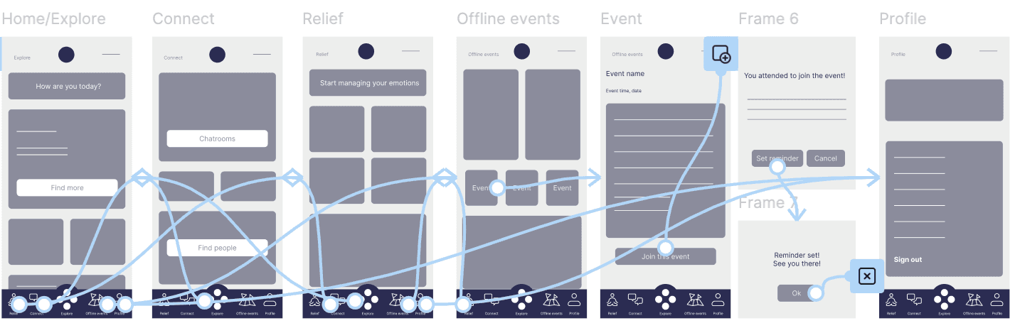 High-fidelity wireframes define the four main flows: Explore/Home for mood check-ins, Connect for community, Offline Events for local meetups, and Relief for guided exercises. Each screen was designed around calm, intuitive interactions.